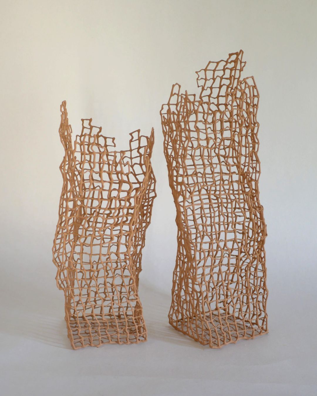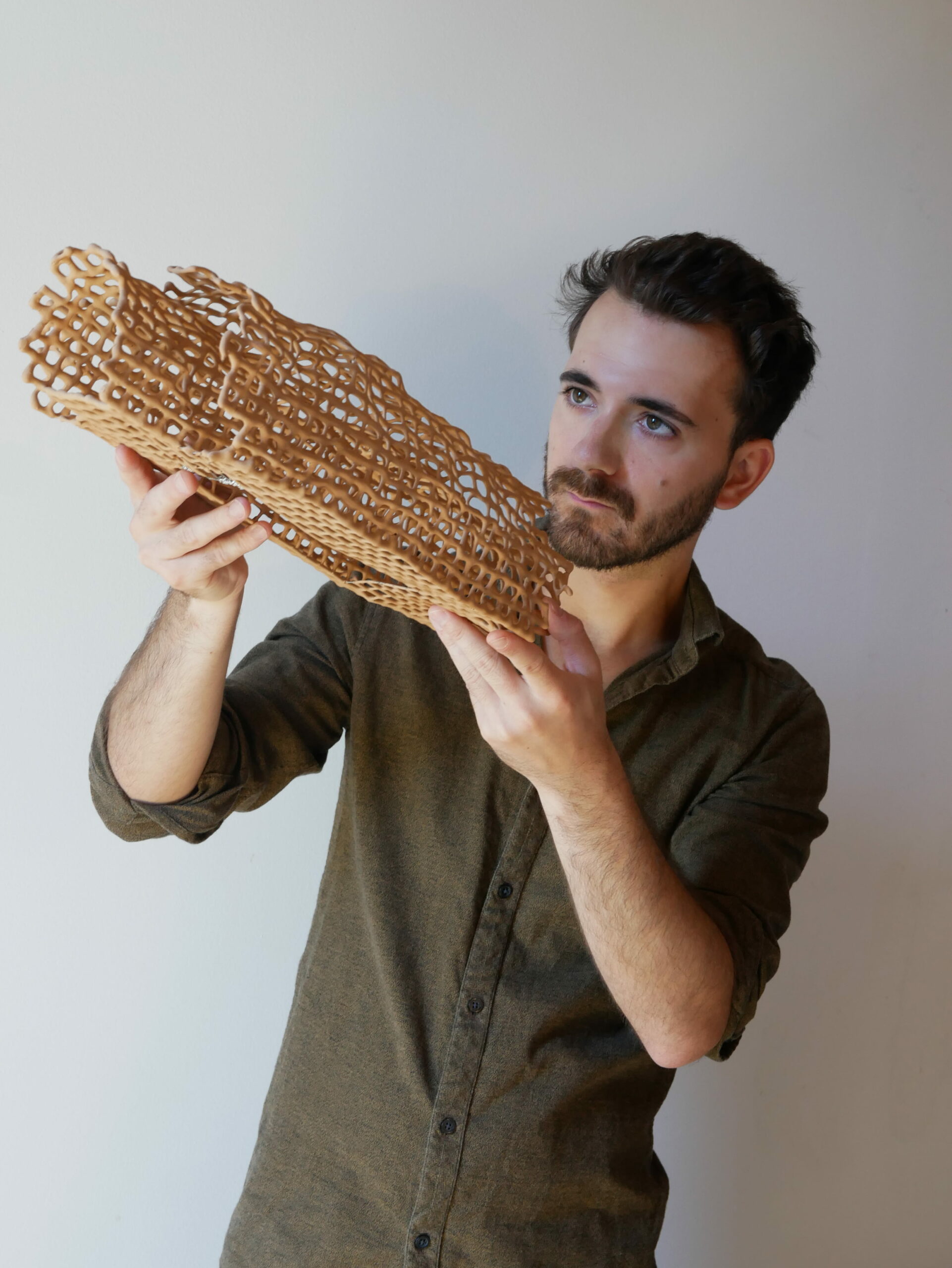 À travers la terre crue stabilisée — matériau qu’il développe et affine depuis plusieurs années — il crée des objets à l’apparence aérienne, où la matière, pourtant minérale, paraît presque suspendue.