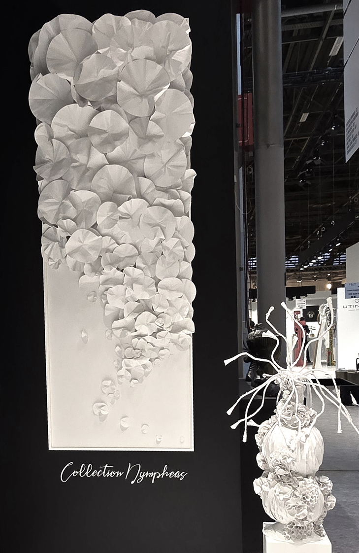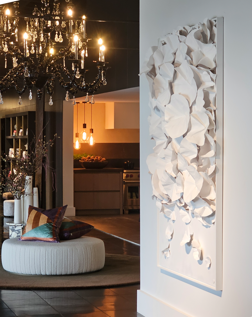 Les jeux d’ombres, de strates et de textures confèrent à ses pièces une présence douce mais affirmée, capable de dialoguer subtilement avec l’architecture et la lumière.