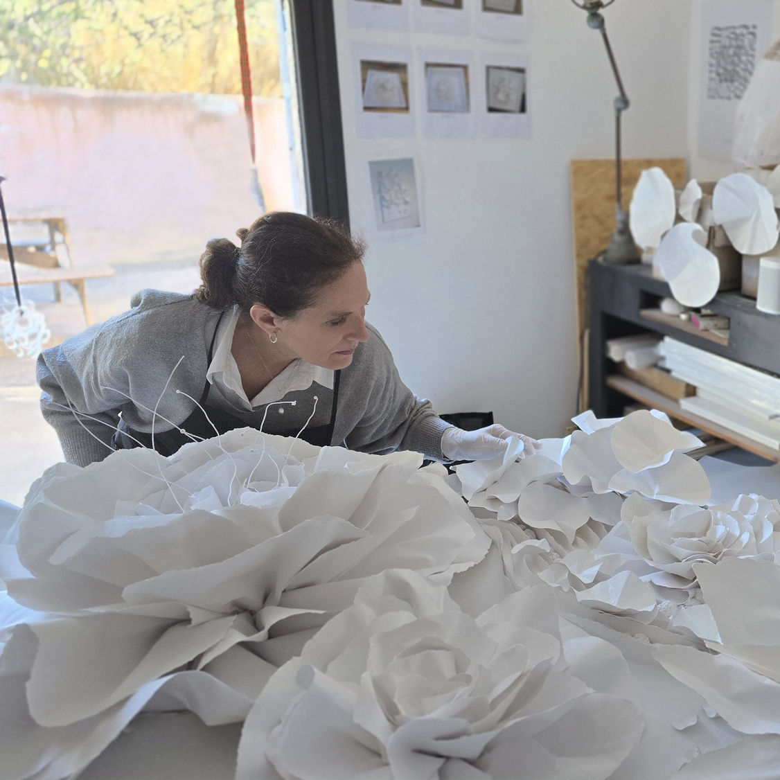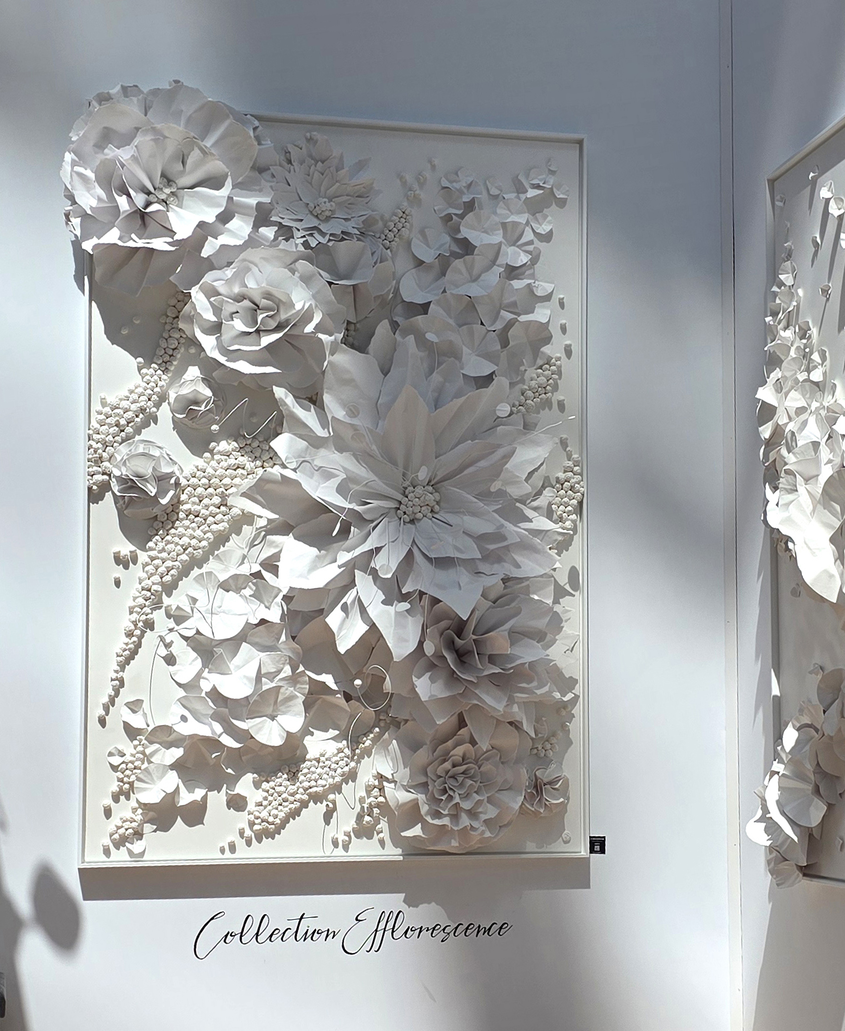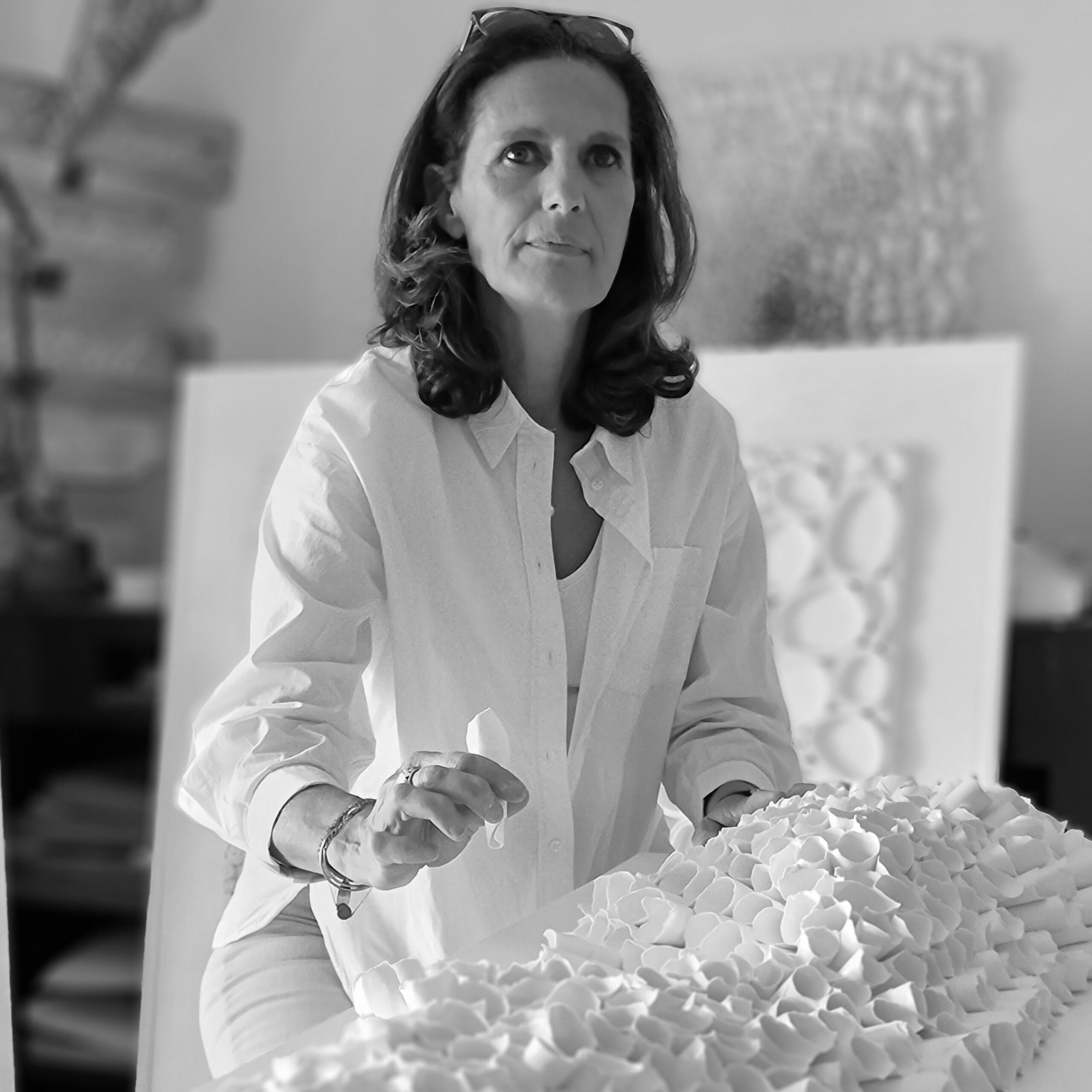Ancienne directrice artistique, elle renoue avec une création intuitive et organique, donnant naissance à des œuvres façonnées à partir de papier découpé, assemblé et modelé à la main.