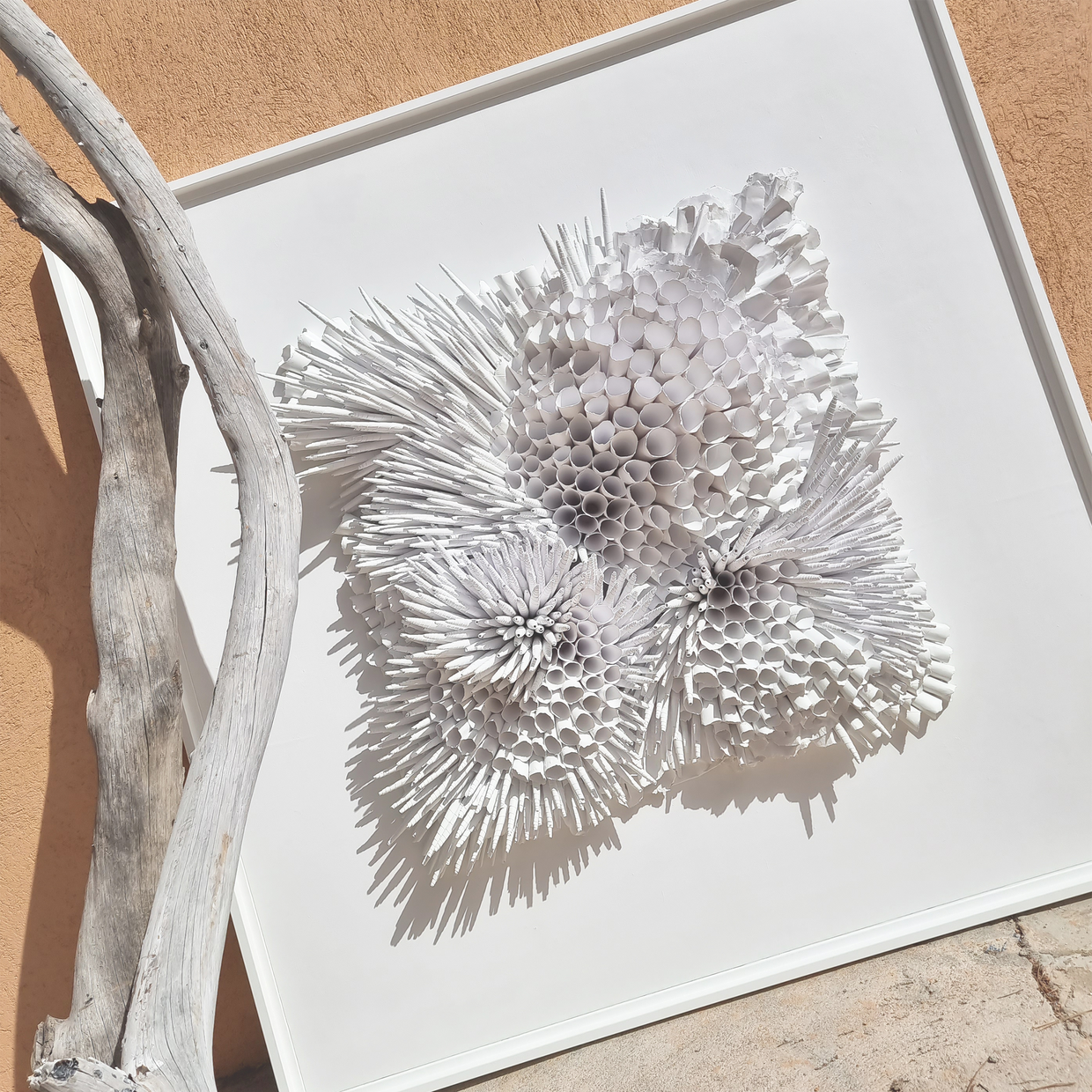 Ses sculptures murales et tableaux en relief se déploient comme des paysages silencieux, entre abstraction et évocation du vivant.